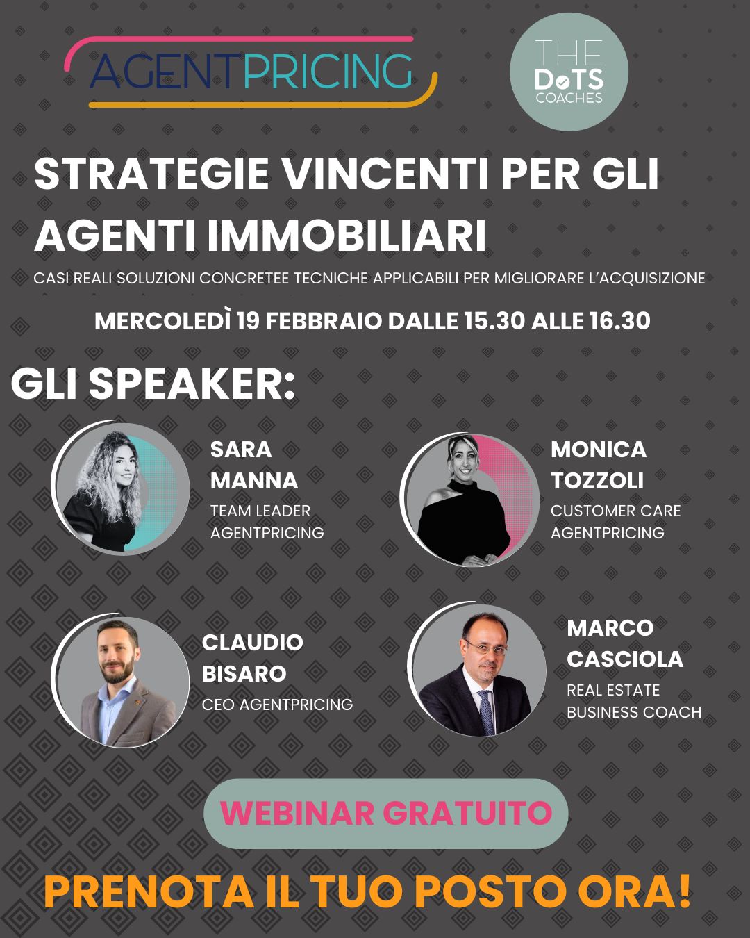📢 Vuoi acquisire più incarichi e migliorare le tue strategie immobiliari? 🔥 Il nostro WEBINAR GRATUITO è l’occasione perfetta per scoprire casi reali, soluzioni concrete e tecniche applicabili per migliorare le tue performance! 🗓 Quando? 📅 Mercoledì 19 febbraio ⏰ Dalle 15:30 alle 16:30 👥 Chi ci guiderà? 🎤 Marco Casciola – Real Estate Business Coach, The DoTS Coaches 🎤 Claudio Bisaro – CEO di AgentPricing.com 🎤 Sara Manna – Team Leader AgentPricing 🎤 Monica Tozzoli – Customer Care AgentPricing 🚀 Un’ora di formazione pratica e ispirazione dedicata agli agenti immobiliari che vogliono fare il salto di qualità nel 2025! 👉 Cosa aspetti? ISCRIVITI SUBITO e non perdere questa opportunità formativa! 📌 Link per l’iscrizione nel primo commento! 🔗 Tagga un collega che non può perdersi questo appuntamento! #WebinarImmobiliare #Formazione #AgentiImmobiliari #RealEstate #StrategieVincenti #TheDotsCoaches #AgentPricing