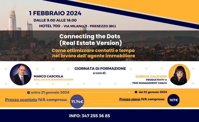 Ci sono progetti che vanno preparati per bene e la preparazione richiede tempo. Poi però partono. Questo è partito. 🔵 Giorgia Califano ed io abbiamo unito i puntini 🔵 Sei un #agenteimmobiliare? Ti aspettiamo a Bergamo per connettere alcuni "Punti fermi" da cui tracciare la tua #strategia per un 2024 strepitoso! 🚀 Per info: +39 347 255 3685 #realestate #businesscoach #timemanagement #productivity #connectingthedots Ci vediamo con tutti lungo il percorso.